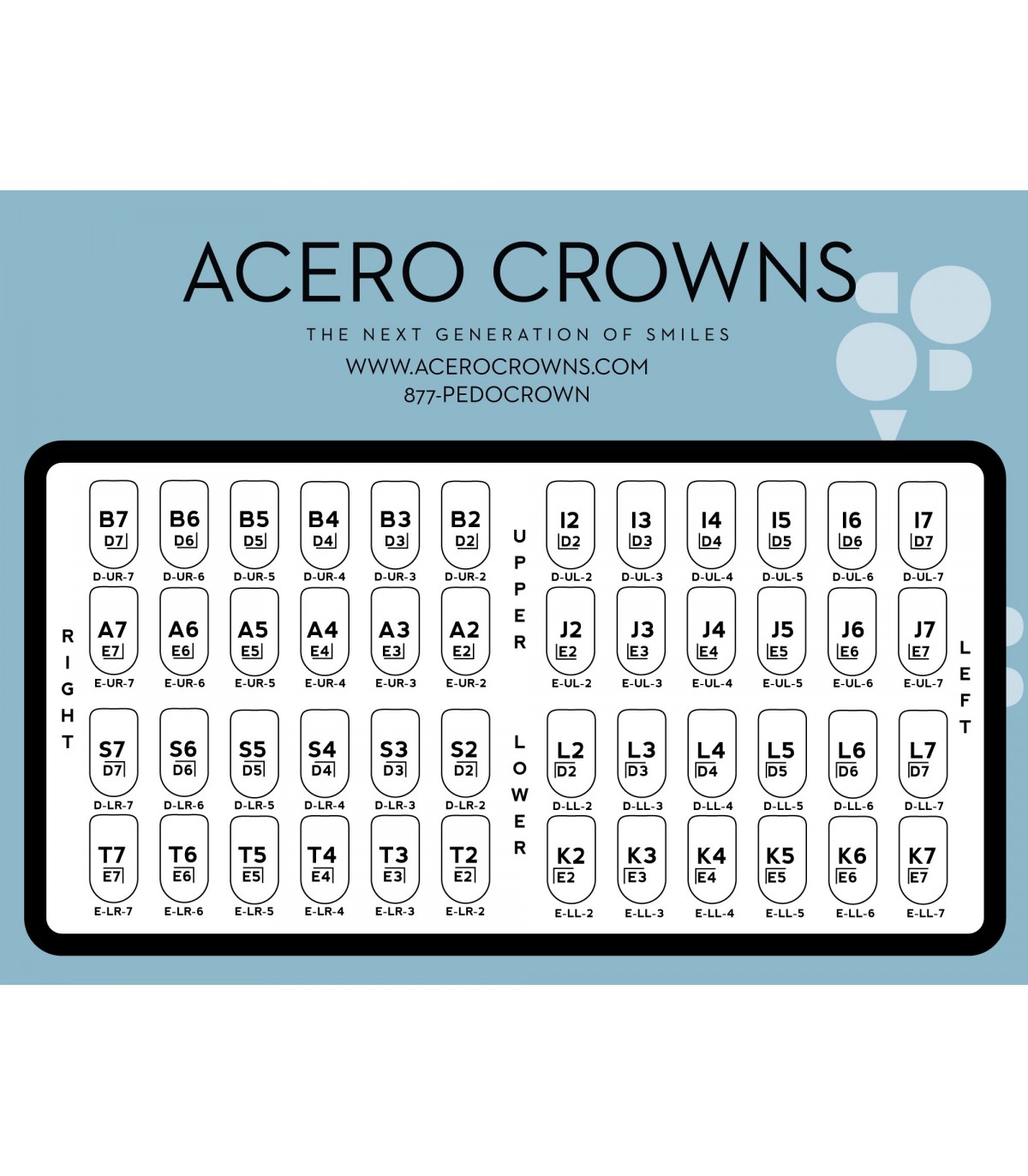 کراون های موقت اطفال Acero Crowns آکرو  نوع 3S از استنلس استیل 316L (نسل جدید در حوزه پزشکی با درصد کربن پایین) ساخته شده است که نسبت به استیل 304 (استفاده شده در محصولات رقبا) از مقاومت بالاتری نسبت به زنگ زدگی و اکسید شدن برخوردار است.