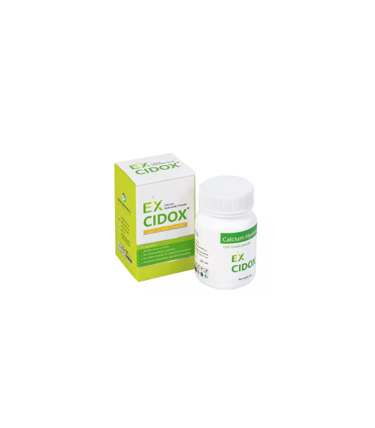 محصول کلسیم هیدروکسید EX CIDOX عاری از عناصر سنگین و کاملاً خالص می باشد و استفاده از آن هیچگونه واکنش التهابی در پی نخواهد داشت. این فرمول با pH>12 و نیز رهایش پایدار و تقویت شده یون های Ca و OH ضمن القاء خاصیت ضد باکتری و عفونت زدایی مؤثر باعث افزایش pH در کانال و متعاقباً تحریک سرعت ترمیم و کلسیفیکیشن عاج می گردد. EX CIDOX با رئولوژی تقویت شده خود امکان نفوپذیری موثر و در عین حال آب بندی مطلوب کانال ریشه را فراهم می آورد و همراه کلیه سیلرها و گوتاپرکا قابل استفاده است. رادیواپاسیتی EX CIDOX در حدود %300 Al می باشد و منطبق بر استاندارد ISO 6876 می باشد.