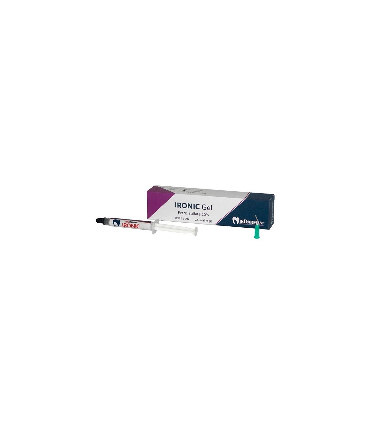آیرونیک ژل منعقد کننده خون (خونبند) حاوی 20 درصد فریک سولفات در یک بستر ویسکوز بی اثر و محلول در آب است.PH این محصول با فرمولاسیون انحصاری شرکت نیک درمان، در حدود 1,0 بوده، لذا محصول حاوی معرف هایی ویژه به منظور تلطیف عملکرد و محافظت از بافت های سخت و نرم دهان می باشد.